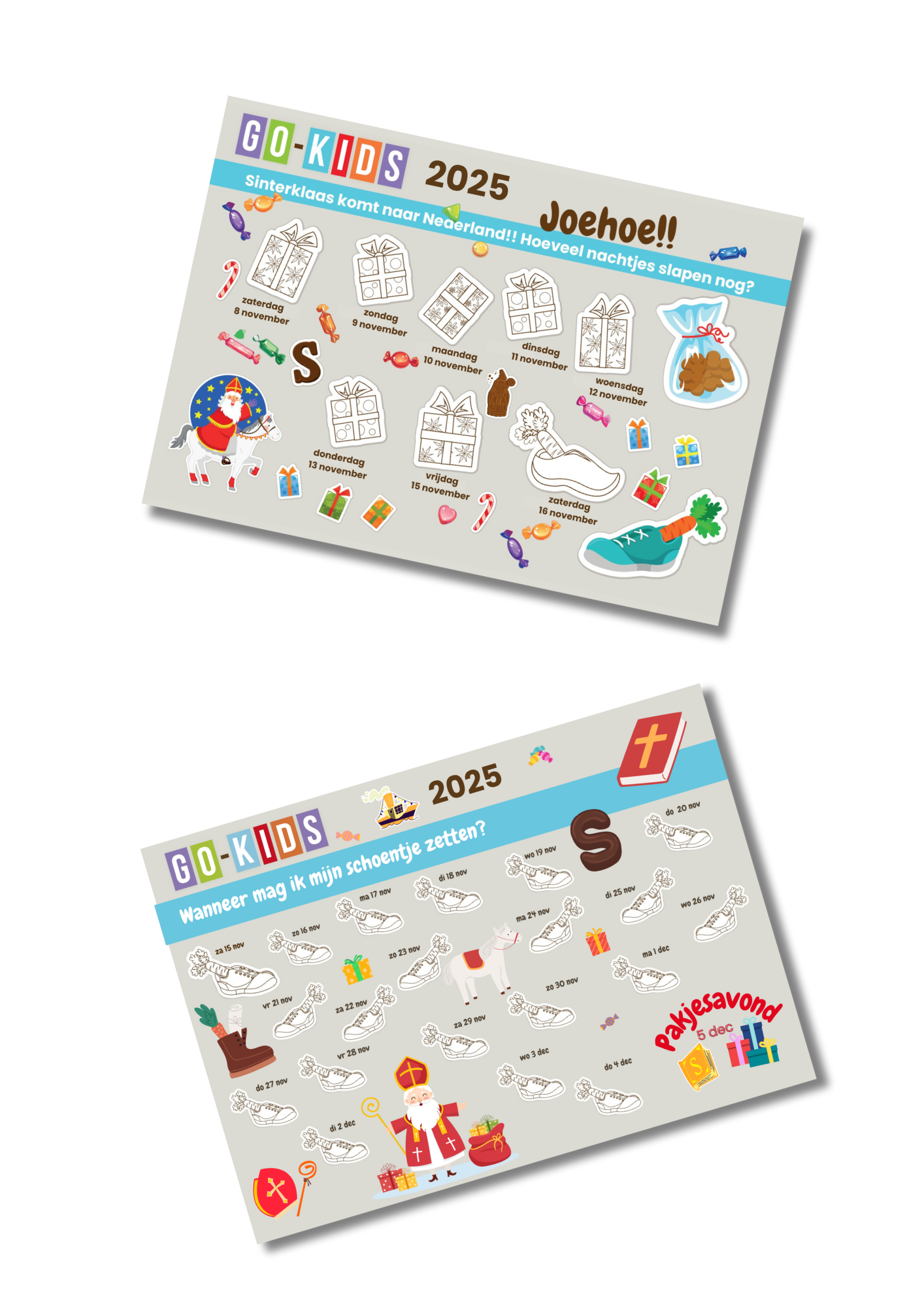 We hebben bij Go-Kids superleuke Sinterklaas aftelkalenders voor je gemaakt: één die aftelt tot de landelijke intocht en een schoenzetkalender.